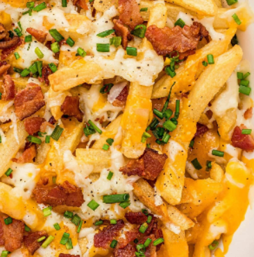 Frytki (350g) boczek, gorgonzola, lazur złocisty, sos śmietanowy, szczypiorek -